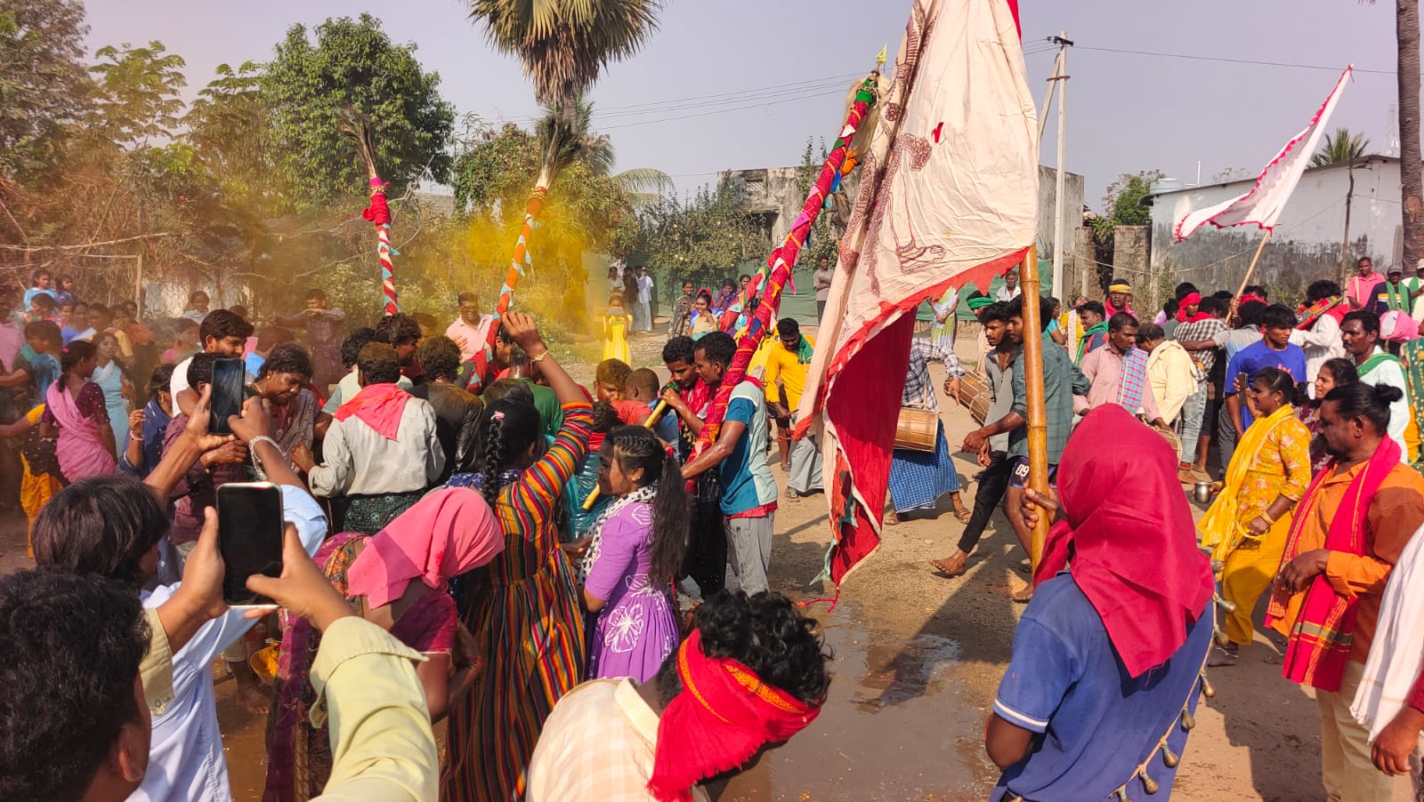 అమ్మవార్లని జెండాలతో ఎదుర్కోలు చేస్తున్న వడ్డెలు