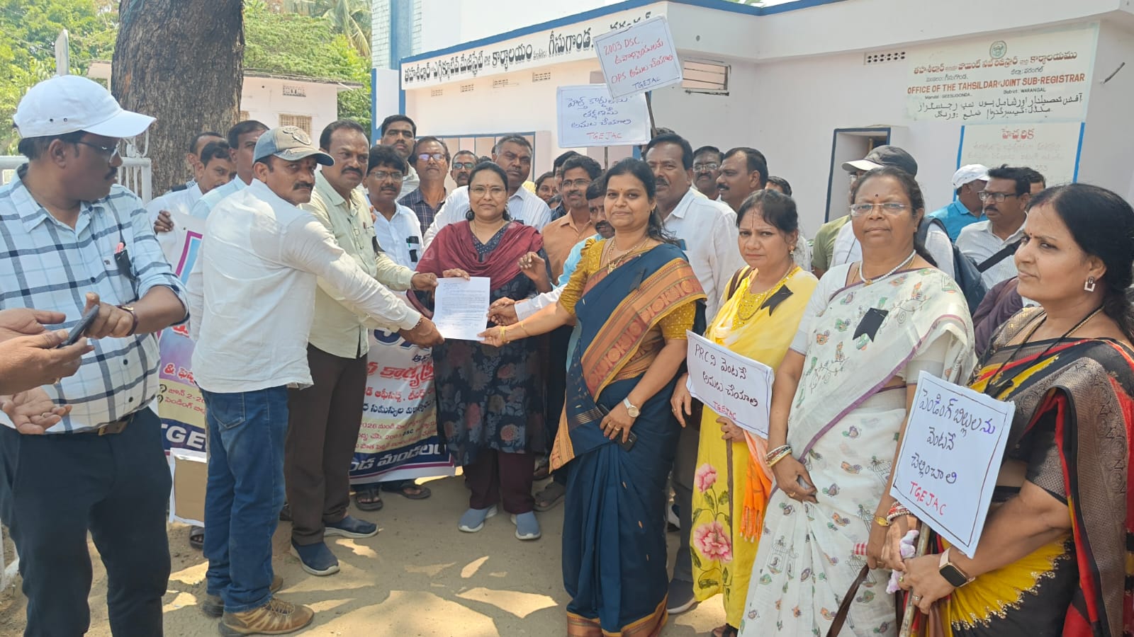 గీసుకొండ, అక్షర సవాల్: ప్రభుత్వంపై ఉద్యోగుల ఆగ్రహం బహిర్గతమైంది. గీసుకొండ తహసీల్దార్ కార్యాలయం శుక్రవారం నాడు నిరసనలతో దద్దరిల్లింది. పిఆర్సి ప్రకటనలో జాప్యం, పెండింగ్ బిల్లుల చెల్లింపుల్లో ఆలస్యం వంటి సమస్యలపై ఉద్యోగులు, ఉపాధ్యాయులు ఏకమై గట్టిగా గళమెత్తారు. టీజీఈజేఏసీ పిలుపుతో జరిగిన ఈ ముట్టడి కార్యక్రమంలో సుమారు వందమంది ఉద్యోగులు పాల్గొన్నారు. కార్యాలయం ఎదుట నినాదాలతో ఆందోళన చేపట్టిన వారు, అనంతరం ఎమ్మార్వో కార్యాలయంలో సీనియర్ అసిస్టెంట్కు మెమోరాండం సమర్పించారు. ప్రభుత్వం నిర్లక్ష్య వైఖరిని తీవ్రంగా ఖండించిన ఉద్యోగ సంఘాలు, తమ హక్కులను ఇకపై వాయిదా వేయలేమని స్పష్టం చేశాయి.“ఇప్పటికైనా స్పందించకపోతే ఉద్యమం మరింత ఉధృతం అవుతుంది” అని హెచ్చరించాయి.